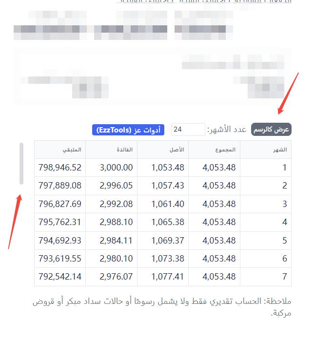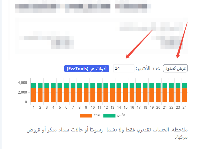 ملاحظة: الحساب تقديري فقط ولا يشمل الرسوم الإضافية أو حالات السداد المبكر.